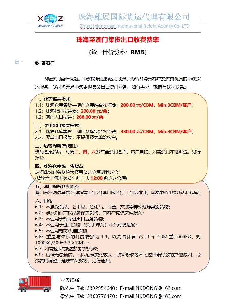 2.1:珠海仓库集货—澳门仓库综合物流费:330.00元/CBM,Min:3CBM/客户;